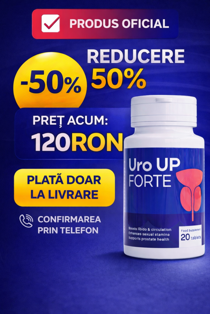 Problemele prostatei și urinare nu dispar de la sine și se pot agrava în timp, afectând somnul, energia de zi cu zi și calitatea vieții. Uro Up Forte oferă o alternativă naturală și fără prescripție medicală, ideală pentru bărbații care vor să-și recapete confortul fizic și siguranța în viața de zi cu zi. Cu plată la livrare și livrare discretă, este un produs pe care îl poți avea rapid, fără stres, direct la ușa ta. Nu mai amâna — oferta de reducere este valabilă doar pentru o perioadă limitată și stocurile nu sunt garantate pe termen lung. Acționează acum și ia controlul asupra sănătății tale!
